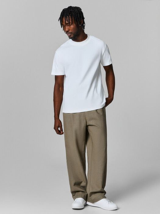 Брюки прямые, посадка средняя. Пояс отрезной с эластичной тесьмой внутри. По переду пробиты петли и втянут шнур-бейка из основного полотна с застроченными концами. В боковых швах обработаны карманы. По переду обработан гульфик с супатной застежкой на петли и пуговицы. На задней правой половинке накладной карман. Нижние срезы брюк обработаны швом вподгибку.