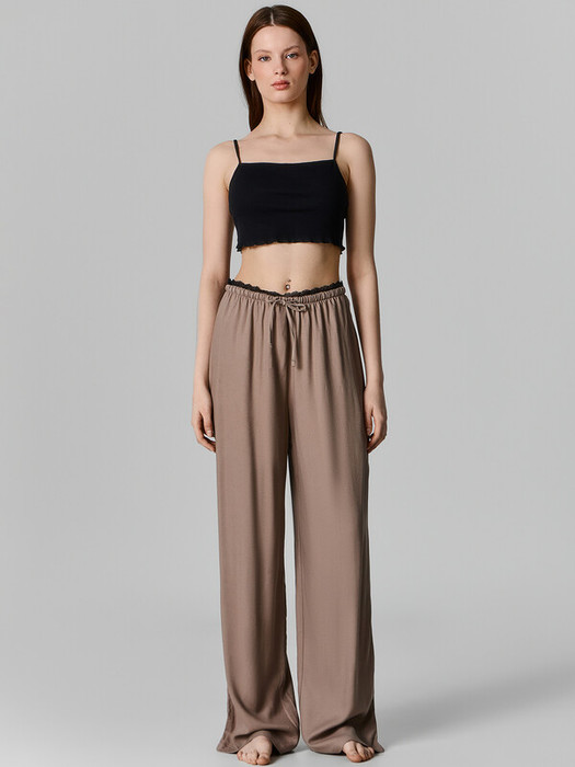 Брюки прямые свободные, посадка средня. Пояс цельнокроеный с эластичной тесьмой внутри (внутр. 20RV). С внешней стороны пояса пробиты петли и вставлен шнур-бейка из основного полотна. По верхнему срезу отделка из кружева 2.4см (L156-2.4, арт. JS00017-2.4). Брюки с боковыми швами. Нижние срезы обработаны швом вподгибку с закрытым срезом.