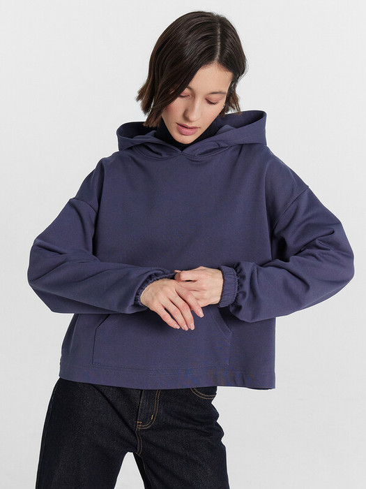 Худи свободного силуэта, укороченное. Горловина круглой формы с капюшоном. Капюшон  цельнокроеный с подкладкой.  Рукава втачные длинные обработаны швом вподгибку с эластичной тесьмой внутри (вн. 30мм 30RV). Плечо спущено. На детали переда накладной карман «кенгуру». Нижний срез обработан швом вподгибку.
