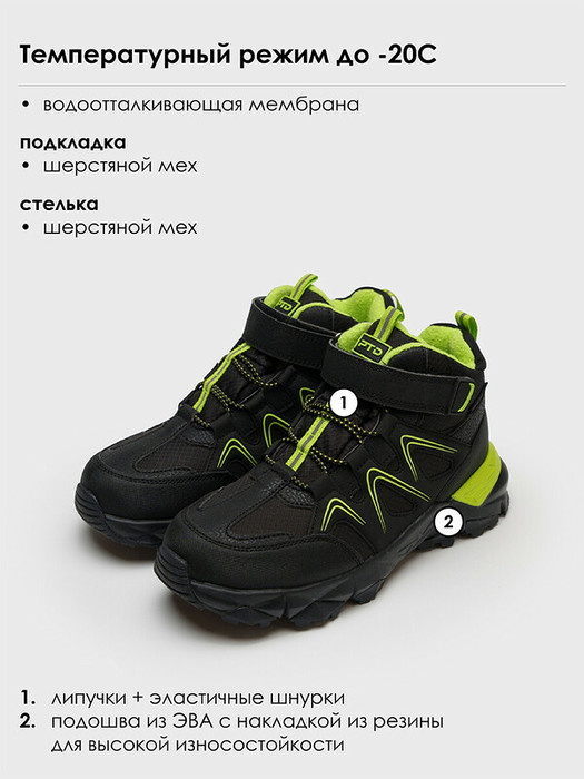 Ботинки зимние с мембраной для мальчика подростка. Конструкция верха изготовлена с использованием мембранных технологий. Верх обуви имеет водоотталкивающее покрытие. Усиленная защита носочной и пяточной части специальными материалами. Удобная застежка-липучка и эластичный шнурок. Модель имеет светоотражающие элементы. Подкладка и стелька выполнены из шерстяного меха 80%. Съемная стелька. Формоустойчивый задник поддерживает стопу в правильном положении. Подошва из облегченного и гибкого ЭВА имеет дополнительные вставки из терморезины с хорошими противоскользящими свойствами. Рекомендованный температурный режим ( зависит от активности ребенка и поддевы под обувь) от 0°С до -20°С. Модель из капсульной коллекции DIGITAL TRANSFORM (ДИДЖИТАЛ ТРАНСФОРМ). Соберите полный образ в едином стиле!