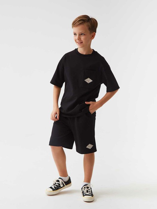 Однотонный трикотажный комплект из футболки и шортов. Футболка из мягкого трикотажа из 100% хлопка. Прямой крой со спущенной линей плеча. Круглый вырез горловины. Один накладной карман на груди. На кармане нашивка. Однотонные шорты повторяют нашивку на кармане футболки. Мягкий трикотаж из 100% хлопка. Свободный крой, средняя посадка, эластичный пояс с кулиской. Функциональные скошенные карманы по бокам и один накладной карман сзади. Размерный ряд 116 – 176 см.