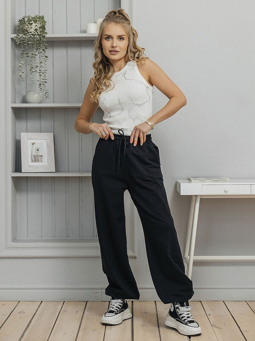Брюки унисекс из футера 2-х нитки (95% хлопок, 5% эластан). Плотный, мягкий и эластичный материал обеспечивает комфортную посадку, не сковывает движения и сохраняет форму после стирки. Практичный вариант для повседневного гардероба. Цвет — чёрный.