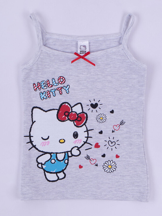 Майка для девочки серый меланж с принтом Хелло Китти. Уютная трикотажная маечка на тонких бретелях выполнена из супрема пенье. Маечка для девочек украшена принтом в виде милого котенка с бантиком.