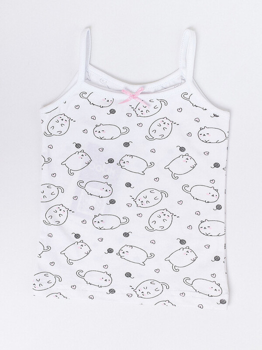 Майка для девочки белая на тонких бретелях с принтом в виде котиков. Майка для девочки состоит из натурального хлопка 92% с добавлением 8% эластана, благодаря чему не растягивается и не садится даже после многочисленных стирок, надолго сохраняя свой первоначальный вид. Майка детская для девочки не теряет цвет после стирки.Характеристики:Материал: Супрем пенье 92% хлопок 8% эластанПроизводитель: batik