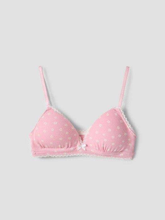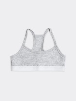 Мягкая  треугольная чашка со сборкой по нижнему срезу, со съемным вкладышем на подкладке из кулирного полотна. Ластовица на подкладке из кулирного полотна. Верхний срез чашки, пройма, верхний и нижний срезы стана обработаны декоративной эластичной тесьмой. Бретели. Кольца/регуляторы.
