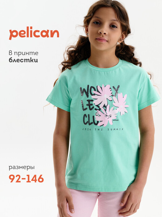 Футболка для девочки маленького объема. Выполнена из 100% хлопка. Эластичная рибана на вырезе горловины гарантирует, что футболка будет легко надеваться и сниматься, не теряя при этом своей формы. В принте глиттер разных цветов. Перевод: клуб «Беспокойтесь меньше»; присоединяйтесь к лету.