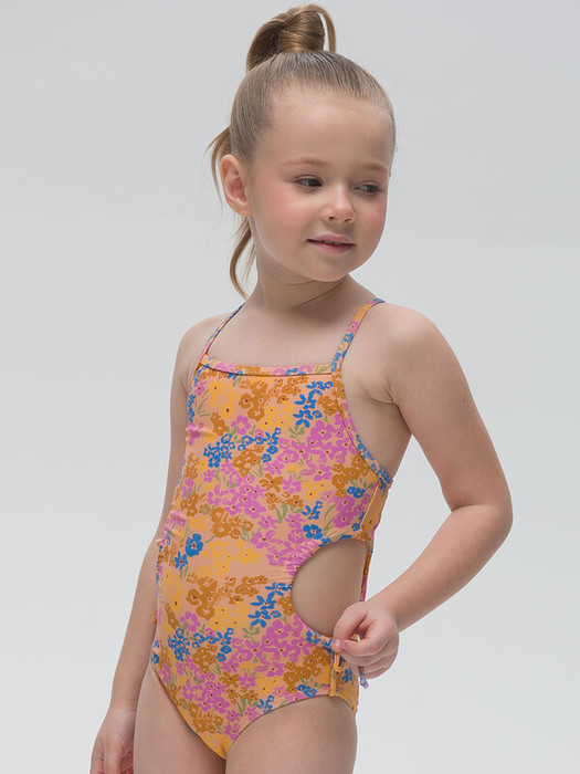 Купальник слитный для девочки. Мягкая эластичная ткань разработана специально для купальных костюмов и идеально садится по фигуре.  Быстро сохнет и практически нет выгорания на солнце. По бокам купальника круглые отверстия, которые можно затянуть шнуром из основной ткани, что позволяет регулировать купальник по росту девочки. Лямки с регулировкой по длине. Подходит для пляжа, моря, бассейна.