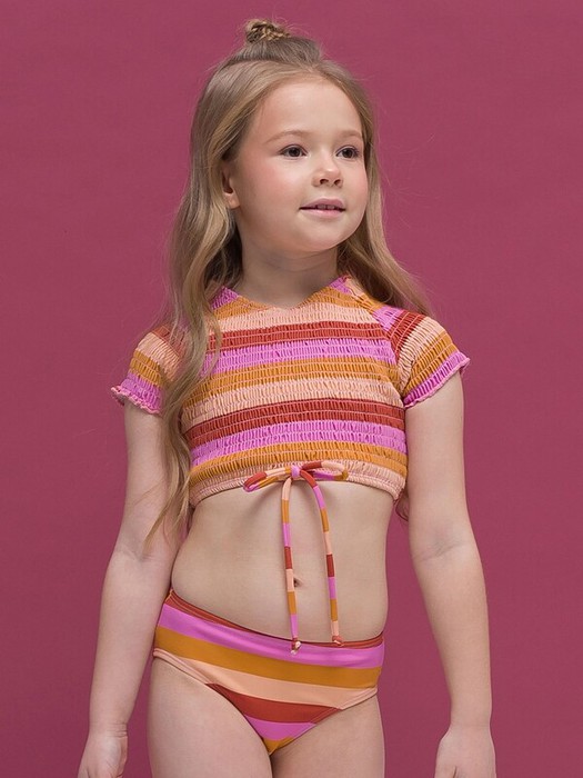 Модный раздельный купальник для девочек. Яркий купальник с принтом для юной русалочки и законодательницы моды пляжа и моря. Верх - топ кроп, укороченная футболка с рукавами реглан, круглой горловиной. Весь топ собран параллельными эластичными строчками. По переду топа пришит бантик из основной ткани. Низ - трусы с увеличенной высотой посадки. Топ можно носить отдельно с шортами, велосипедками все лето. Купальник для девочки с принтом в полоску создан из качественной, специализированной ткани, хорошо пропускает воздух, плотно прилегает к телу ребенка и не соскальзывает во время купания. Костюм для плавания не становится тяжелый при намокании и очень быстро сохнет. Благодаря эластичности полотна, купальник детский комфортно сядет по фигуре, его легко надевать и снимать. Стильный и практичный купальник для пляжа и для бассейна, подойдет для водных видов спорта, на пляж, для отдыха. Красивый купальник подойдет для малыша, для детей и подростка, которые любят загорать на пляже и купаться в воде. Защитит от солнца и подарит максимум комфорта и свободы движений.