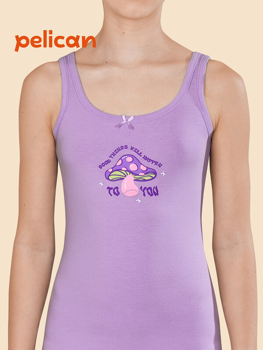 Майка детская для девочки. Нательная майка для девочки выполнена из ткани с высоким содержанием хлопка — она приятна на ощупь, гипоаллергенна и великолепно пропускает воздух. Эластан помогает изделию сохранять отличную форму в течение длительного времени. Качественная ткань и правильный крой гарантируют комфортную посадку. Горловина и проймы обработаны эластичным пайпингом в тон — они не растягиваются и надолго сохраняют прекрасный внешний вид. Хлопковая майка нежного сиреневого цвета (актуальный оттенок лаванды) понравится любой девочке. Красивая майка декорирована позитивным принтом в виде грибочка, надпись переводится: «хорошие вещи произойдут с тобой». Принт мягкий и устойчивый, легко переносит частые стирки. Майка детская для девочек  — идеальный выбор для повседневной носки под одеждой, а также она подходит для летнего отдыха и в качестве домашней одежды. Помните о правильном уходе за изделием: рекомендуется стирать при температуре не выше 30 °C, без предварительного замачивания, с изнанки. Это поможет сохранить качество и цвет майки на длительное время.