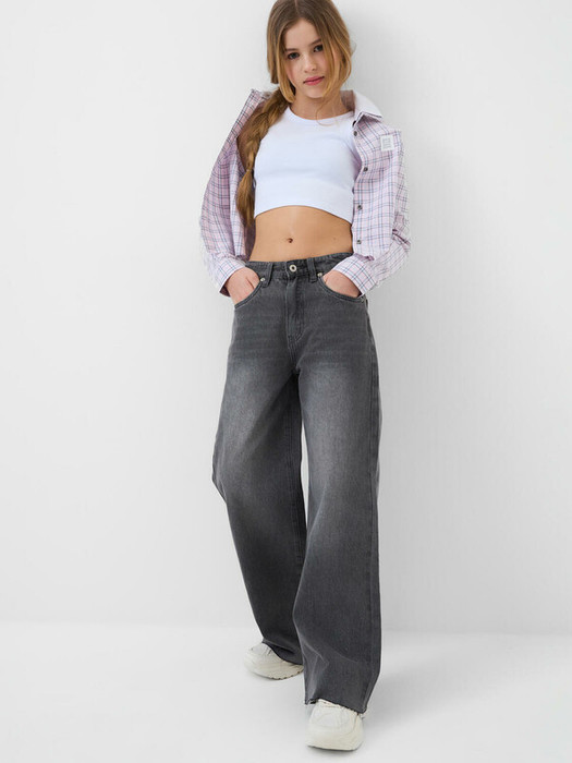 Джинсы широкие для девочки подростка. Спереди классическая застежка на молнию и болт. Модель wide leg свободного прямого кроя с высокой посадкой и длинными широкими штанинами.  Есть пять карманов: два спереди, два сзади и один маленький внутренний. На заднем кармане — декоративная этикетка. Пояс с шлевками и регулировочной резинкой внутри. Низ брюк необработан, с модным бахромчатым краем. Отлично подойдут для повседневного гардероба в весенне-летний сезон.