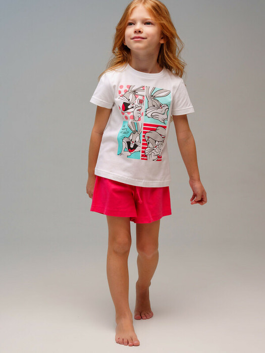 Пижама детская для девочки. Футболка и шорты из эластичного и приятного на ощупь трикотажа. Шорты на резинке со шнурком. Высокое содержание хлопка 95%. Благодаря наличию эластана в составе ткани изделие держит форму и меньше мнется. Модель выполнена из качественного и приятного на ощупь трикотажа.