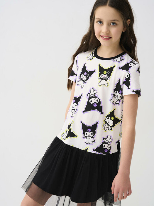 Стильное платье для девочки подростка. Верх выполнен в виде футболки прямого кроя с короткими рукавами, а по низу пришита объёмная юбка из чёрной сетки. Украшена яркими принтами с любимым мультяшным персонажем Куроми. Горловина круглая, с аккуратной отделкой. Платье выполнено из мягкого хлопкового трикотажа джерси, юбка — из лёгкой сетки. Внутри швы усилены силиконовой лентой для надёжности и комфорта.