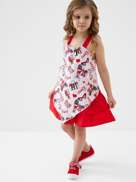 Лёгкий летний детский сарафан для девочки. Выполнен из хлопкового мягкого текстиля поплин. Модель свободного силуэта, с красивыми декоративными воланами по низу и оригинальной формой подола. Верх изделия собран на эластичную горловину и дополнен широкими бретелями. Передняя часть украшена ярким принтом с элементами в духе модных городов. Сарафан длиной чуть выше колена.