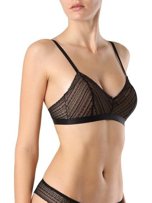 Бюстгальтер без каркасов Vintage RB7087 выполнен из кружева с ажурным орнаментальным рисунком и прямым краем. Чашки на подкладке из дубляжа с хлопком. Модная треугольная форма, безупречная посадка на фигуре и абсолютный комфорт – визитная карточка модели.