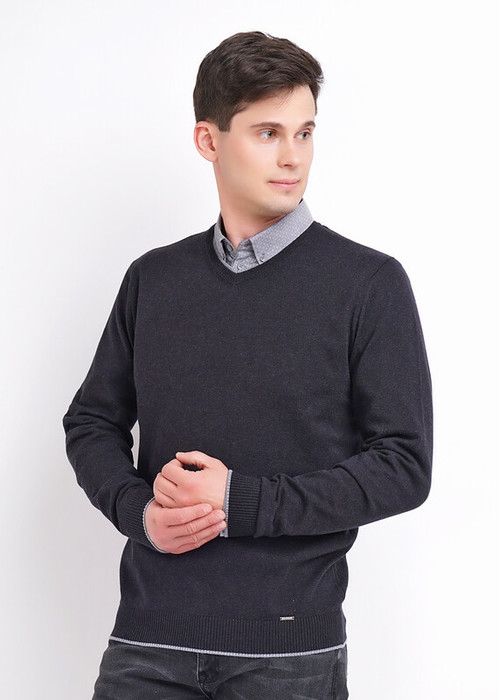 Мужской вязаный джемпер с V-образным вырезом горловины в базовом ассортименте. Целостность модели придают двойная контрастная горловина, декоративная полосатая тесьма и провязаная обтачка по спинке. Модель дополняет металлофурнитура по низу.