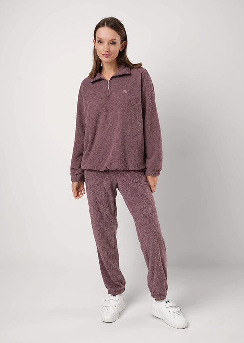 Женский костюм из велсофта ""барашек"", состоящий из джемпера и брюк. Джемпер с воротником стойка на молнии, на детали переда фирменная вышивка. По низу изделия и рукавов резинка. Брюки с боковыми карманами, по низу брюк резинка.