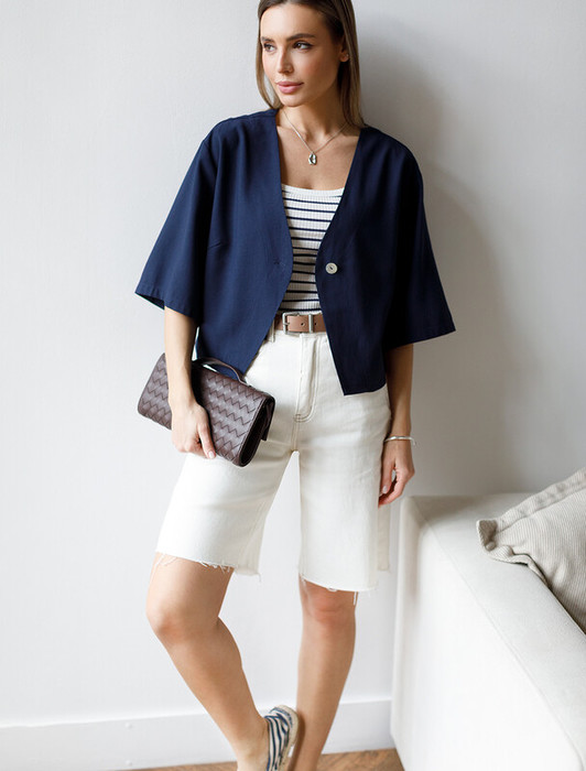 Блузка свободного кроя в стиле кимоно выполнена из плотного лиоцелла. Модель со спущенным плечом и застежкой на одну пуговицу. Ткань изделия отлично держит форму, плавно драпируется и не просвечивает. В теплое время года приятно охлаждает кожу. Добавление синтетических волокон в составе изделия, предотвращает сминаемостьи поддерживает формоустойчивость. Блузка сочетается в костюме с брюками D24.261, D24.265, D24.267, шортами D28.057 и  юбкой D24.261, а также очень эффектно с белыми шортами и джинсами.