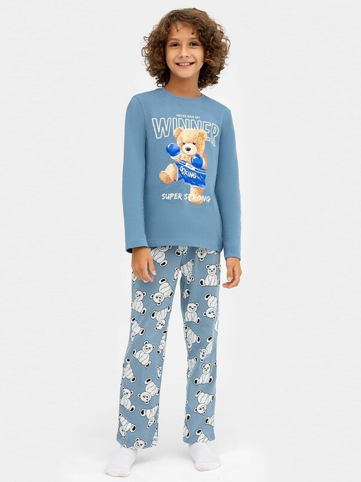 Стильная и комфортная пижама для мальчиков. Выполнена из хлопковой трикотажной кулирки. Пижама состоит из лонгслива с круглой горловиной и длинных брюк с эластичной тесьмой в поясе. Для самых комфортных снов!