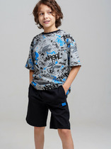 Худи свободного силуэта для мальчиков с капюшоном. Горловина округлой формы. Капюшон со средним швом, на подкладке из основного полотна. Плечо спущено, рукав втачной длинный. По низу рукава отрезная манжета из рибаны. Пояс отрезной из рибаны.Брюки для мальчиков. Без бокового шва. Карманы в вытачке. Пояс отрезной с внутренней эластичной тесьмой. Пояс прострочен двумя отделочными строчками. Внутри в пояс втянут шнур. Низ брюк обработан манжетами из рибаны.