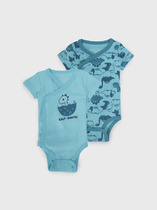 Комплект из двух боди для новорождённого мальчика. Один из боди выполнен на белом фоне с ярким принтом из мультяшных собачек и надписями, второй — голубого цвета с однотонным темно-синим принтом. У обоих изделий длинные рукава и запах на полочке с застежкой на кнопки, что делает их удобными для переодевания. Два ряда кнопок, боди растет вместе с малышом. Материал — мягкий интерлок, приятный к телу и подходящий для чувствительной кожи малышей.