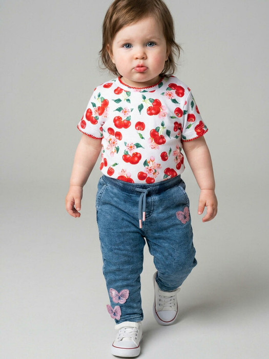Детские брюки для девочки. Модель классического кроя с зауженным низом, выполнена из мягкого хлопкового трикотажа с эффектом денима. У брюк высокий комфортный пояс на резинке и шнурок для регулировки. Спереди и сзади — два удобных кармана. Аппликации с бабочками.