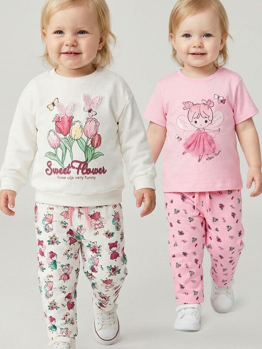 Комплект детских брюк для девочки. Набор из двух брюк выполнен из хлопкового трикотажа джерси. Модель прямого кроя со средней посадкой на талии. Пояс на резинке. Украшены принтами с цветами и феями.