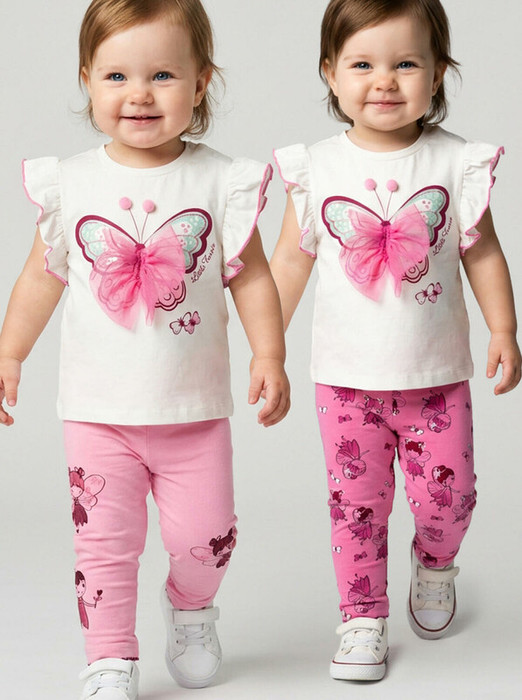 Набор детских легинсов для девочки. Комплект состоит из двух пар длинных легинсов. Принт с цветами в нежно-розовых оттенках. Обе модели имеют высокую посадку и эластичный пояс, который хорошо фиксирует изделие на талии. Материал - мягкий, хлопковый трикотаж.