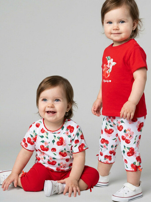 Набор детских легинсов для девочки. Комплект состоит из двух пар укороченных легинсов. Первая пара выполнена в классическом красном цвете, вторая — с ярким принтом вишен, листьев и цветов. Леггинсы украшены декоративными бантиками. Обе модели имеют высокую посадку и эластичный пояс, который хорошо фиксирует изделие на талии. Материал - мягкий, хлопковый трикотаж.