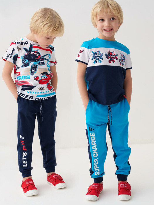 Комплект детских брюк-джоггеров для мальчика. Набор из двух джоггеров выполнен из хлопкового трикотажа джерси. Модель прямого кроя со средней посадкой на талии. Пояс выполнен на резинке, дополнительно регулируется шнурком. По бокам — удобные карманы. В нижней части брючин предусмотрены эластичные трикотажные манжеты для лучшей фиксации. Украшены принтами.