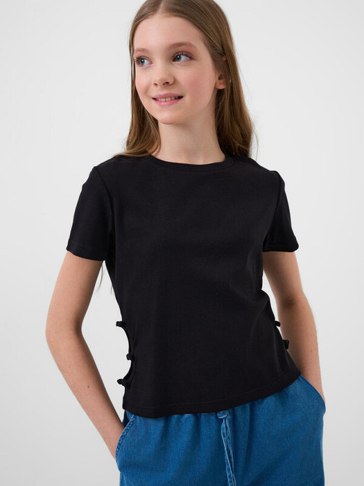 Футболка черная для девочки подростка. Модель приталенного кроя, выполнена из эластичного хлопкового трикотажа в рубчик. По бокам вырезы с декоративными бантиками.