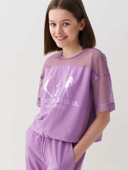 Футболка оверсайз для девочки подростка. Модель выполнена из эластичного хлопкового трикотажа джерси. Рукава и верхняя часть выполнены из сетки. На груди расположен крупный принт. Горловина круглая. В нижней части — шнурок для регулировки посадки.