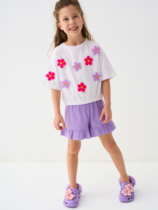 Детская футболка оверсайз для девочки. Модель выполнена из эластичного хлопкового трикотажа джерси. Спереди расположены красочные нашивки в виде цветов. Горловина круглая. По низу эластичная резинка.