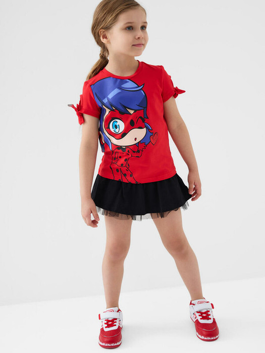 Детская футболка для девочки. Модель прямого кроя, выполнена из эластичного хлопкового трикотажа джерси. На груди расположен крупный принт с любимым мультяшным персонажем Леди Баг. По рукавам декоративные банты.