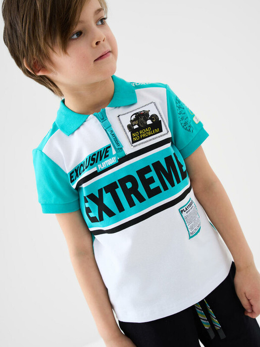 Детское поло с коротким рукавом для мальчика. Модель выполнена в спортивном стиле и украшена яркими принтами. Поло выполнено из хлопкового трикотажа пике. Воротник и манжеты выполнены из эластичного вязаного материала. На груди — короткая застежка-молния.