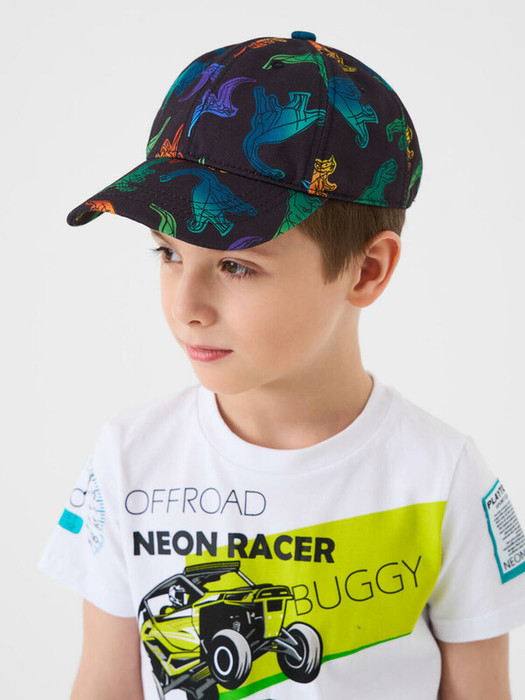 Детская бейсболка с ярким дизайном для мальчика. Модель выполнена в классическом стиле с жёстким изогнутым козырьком и регулируемой застёжкой на кнопки сзади. По бокам — маленькие вентиляционные отверстия.