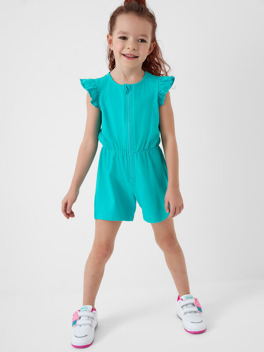 Лёгкий трикотажный комбинезон для девочки. Модель выполнена из хлопкового трикотажа джерси. Рукава-крылышки. Застёжка-молния. На талии — мягкая внутренняя резинка для удобной посадки. Горловина круглая.
