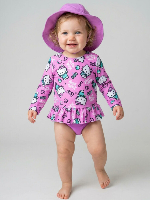 Комплект купальный детский для девочки: футболка с длинными рукавами, плавки и панама. Лонгслив имеет свободный крой и украшен оборкой по низу. Яркий розовый фон дополнен весёлым принтом Hello Kitty. Панама выполнена в том же стиле и защищает голову от солнца, дополнена удобными завязками. Все края обработаны эластичной тесьмой, чтобы изделие хорошо сидело на теле и не натирало. Благодаря UF-защите, ткань сохраняет первоначальный вид даже при длительном пребывании на солнце. Он идеально подходит для пляжа или бассейна.
