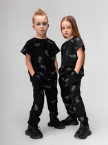 Комплект: футболка, брюки. Размер изделия на фото - 110, параметры модели (см): рост 110, обхват груди-талии-бедер: 58-54-60. Из качественного эластичного и приятного на ощупь трикотажа джерси. Высокое содержание хлопка 95%. Благодаря наличию эластана в составе ткани изделие держит форму и меньше мнется. Принт сохраняет первоначальный вид даже после многочисленных стирок. Эластичный пояс с тесьмой позволяет легко надевать и утягивать до идеальной посадки в зависимости от комплекции ребенка. Нижняя кромка брючин в эластичный рубчик.