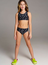 Слитный купальник для девочки подростка. Основной акцент сделан на разноцветный принт в стиле граффити с надписями, брызгами и контрастными цветами: розовый, салатовый, голубой, чёрный и белый. Купальник с эффектными переплетёнными бретелями на спине. Внутри предусмотрена двойная подкладка с чашечками для комфортной посадки. Все края аккуратно обработаны эластичной тесьмой. Модель разработана для активного летнего отдыха и плавания.