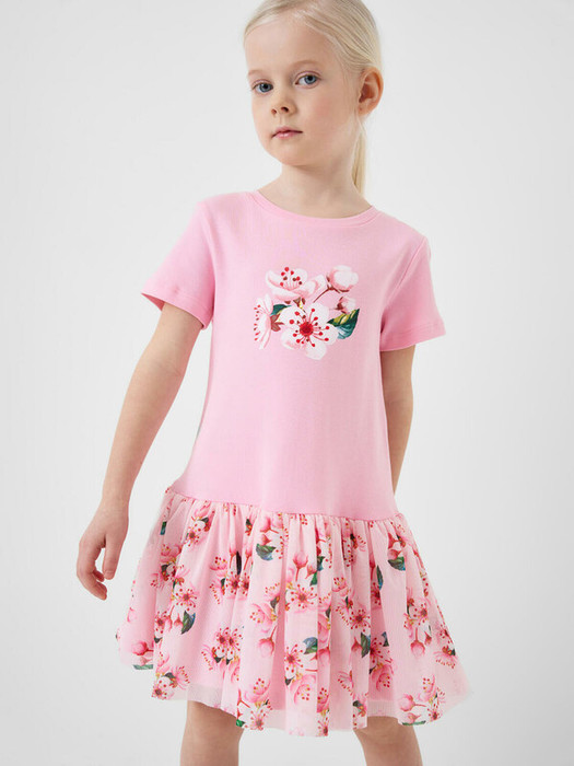 Нарядное детское платье для девочки. Модель из комбинации хлопкового трикотажа интерлок и сетки. Верх выполнен в виде футболки в нежно-розовом цвете и украшен ярким цветочным принтом на груди. Пышная юбка с цветочным рисунком собрана по талии и придаёт изделию нарядный вид.