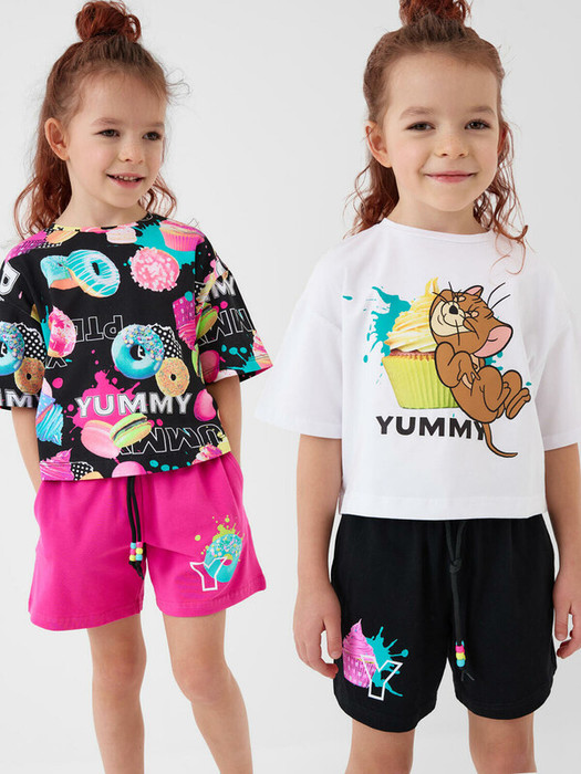 Набор детских шорт для девочки. В комплект входят две пары шорт свободного кроя. Модели из мягкого, хлопкового трикотажа джерси. Удобная посадка обеспечивается эластичным поясом со шнуром. По бокам расположены два кармана.