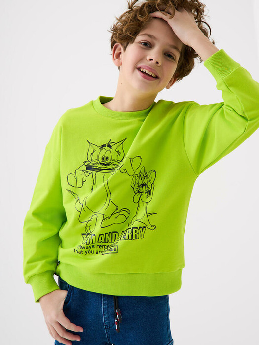Оверсайз свитшот Том и Джерри для мальчика подростка. Модель с круглым вырезом, длинными рукавами и манжетами. Выполнена из футера без начеса. Пояс и манжеты выполнены из эластичного риба, что обеспечивает хорошую посадку. Яркий принт с любимыми героями мультфильма "Tom and Jerry".