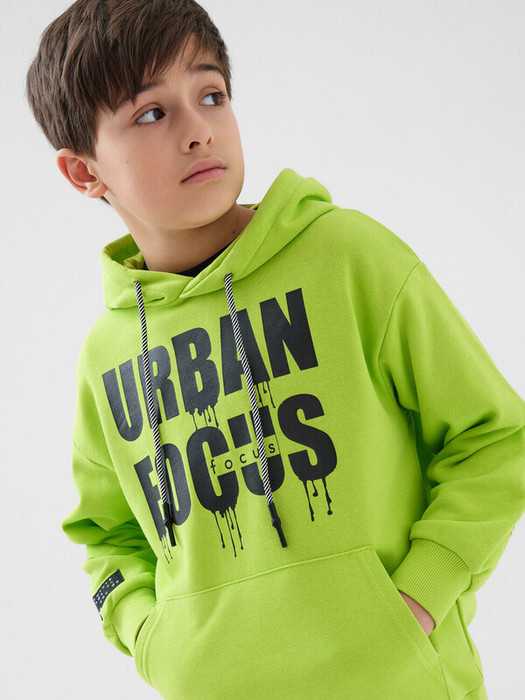Худи оверсайз для мальчика подростка. Выполнено из хлопкового футера без начеса. На груди — крупный принт. Капюшон регулируется шнурком, а на передней части расположен удобный карман-кенгуру. Манжеты и низ изделия выполнены из эластичного риба, что обеспечивает комфортную посадку. На правом рукаве — яркая нашивка.