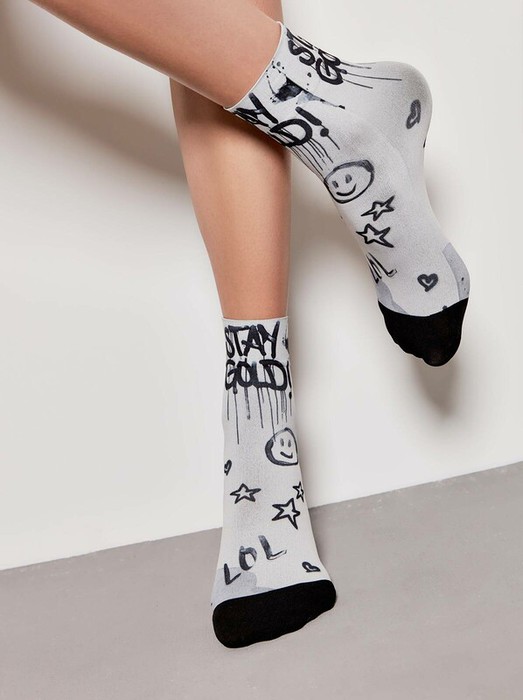 Плотные носки с особенно устойчивым рисунком, нанесенным с помощью термотрансферной печати, станут стильным и индивидуальным акцентом в повседневных образах. Термотрансферная печать - процесс, при котором специальная краска на бумажном носителе резко нагревается, переходит из твердого состояния в газообразное и переносится с бумаги на носки, глубоко проникая в волокна и создавая устойчивое изображение. · 70 den· плотные и эластичные· рисунок, нанесенный с помощью термотрасферной печати· использование черной полиамидной нити для контрастности рисунка· мысок выделен черной полиамидной нитью· эффект 3D· c бортом· без пятки· стиль начинается с индивидуальности.