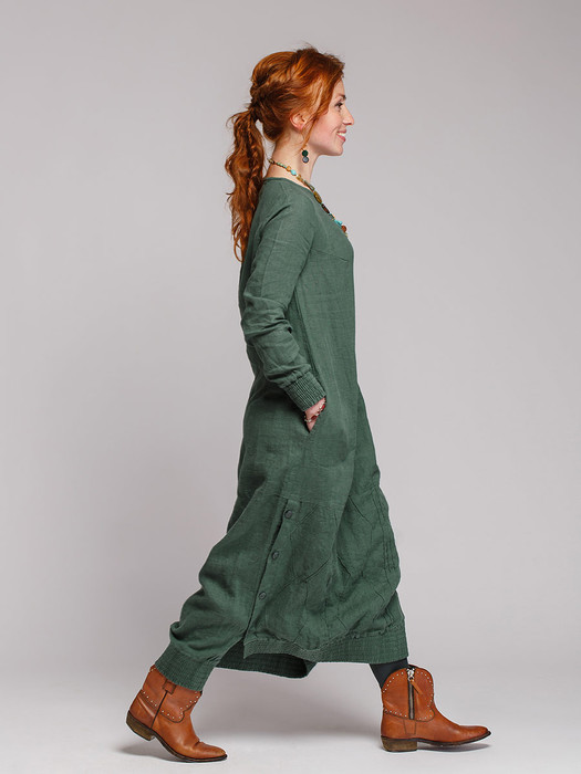 Удивляет как творческая мысль может создать нечто оригинальное незаурядное, из казалось бы простых форм и текстур. Прямой крой платья дополнен вставкой по низу, которая заслуживает внимания. Её геометричный рисунок в сочетании с жатой текстурой льна создаёт эффект вязаной вещи, а застёжка на пуговицы и трикотажная манжета по низу усиливают замысел дизайнера.