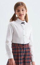 Школьная блузка для девочки. Актуального дизайна из качественного материала для девочки. Кокетка и рукава выполнены из мягкого гипюра.Модель с длинными рукавами. Прекрасный вариант для школьных будней, так и для торжественных случаев. Материал: Вискозное полотно, Производство: Радуга-Дети Состав: 93% вискоза,7% эластан.
