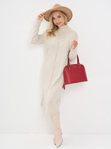Платье свободного силуэта из плательной ткани. По центру передней части изделия выполнен шов. Цельнокроеная стойка, переходящая в V-образный вырез горловины, визуально делает фигуру стройнее. Втачной короткий рукав.