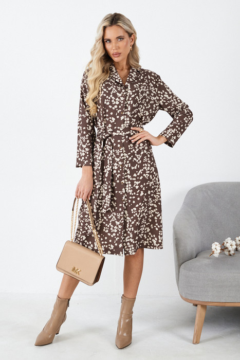 Платье прямого, свободного силуэта из плательной ткани. Изделие с английским воротником и застежкой на кнопки. Втачной длинный рукав. В комплекте пояс из основной ткани, позволяющий создавать приталенный силуэт.