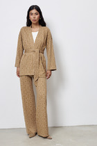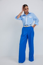 Брюки прямого силуэта выполнены из костюмной ткани. На передней половинке по линии талии застрочены складки. На задней половинке - талиевые вытачки. Карманы с подкройным бочком. Притачной пояс со шлёвками. Застёжка на молнию-гульфик и пуговицу. Такой крой выгодно подчеркнёт длину ваших ног.