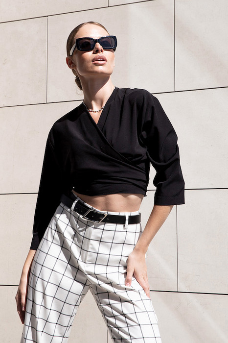 Блуза свободного силуэта из блузочной ткани. На детали полочки цельнокроеные длинные завязки. Вырез глубокий, V-образный. Втачной рукав в спущенную пройму. Длина блузки до линии талии.